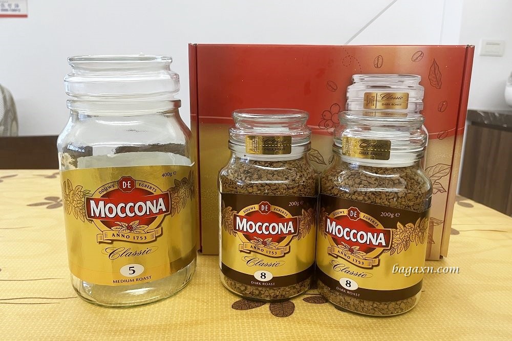 婆婆一直以來都是喝三合一或二合一,忘了何時我被社團燒到,跟買了這瓶【MOCCONA即溶咖啡】,他一喝成主顧,每日早上泡個半杯再加個半杯牛奶喝,大約半年就要喝掉一瓶。一直以來我都不擔心會沒貨,因為跟我們口味一樣的愛好者似乎不多,所以每次去總是都能買到。不過2022年底想買的時候居然沒貨了,連忙上社團搜尋看看有沒有人分享,結果發現好市多推出了較小瓶包裝的禮盒組,還以為應該是一樣的東西,不過看了一下別人分享,禮盒組是8號深烘焙,而原本買的則是5號中烘焙。