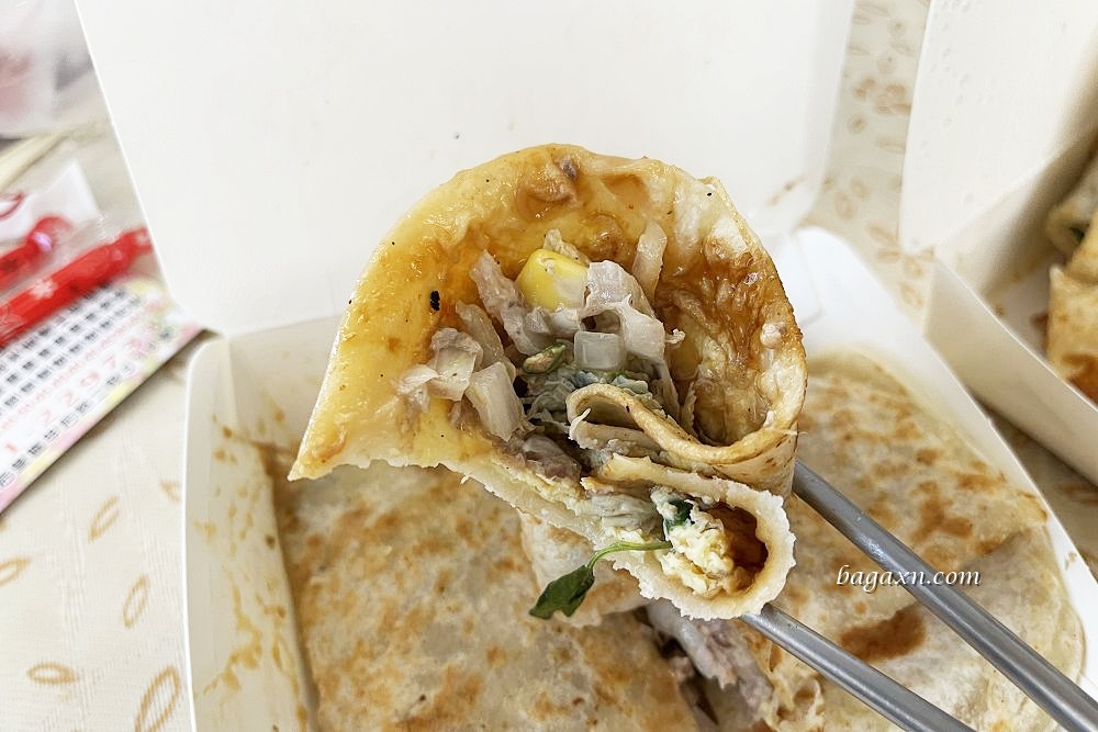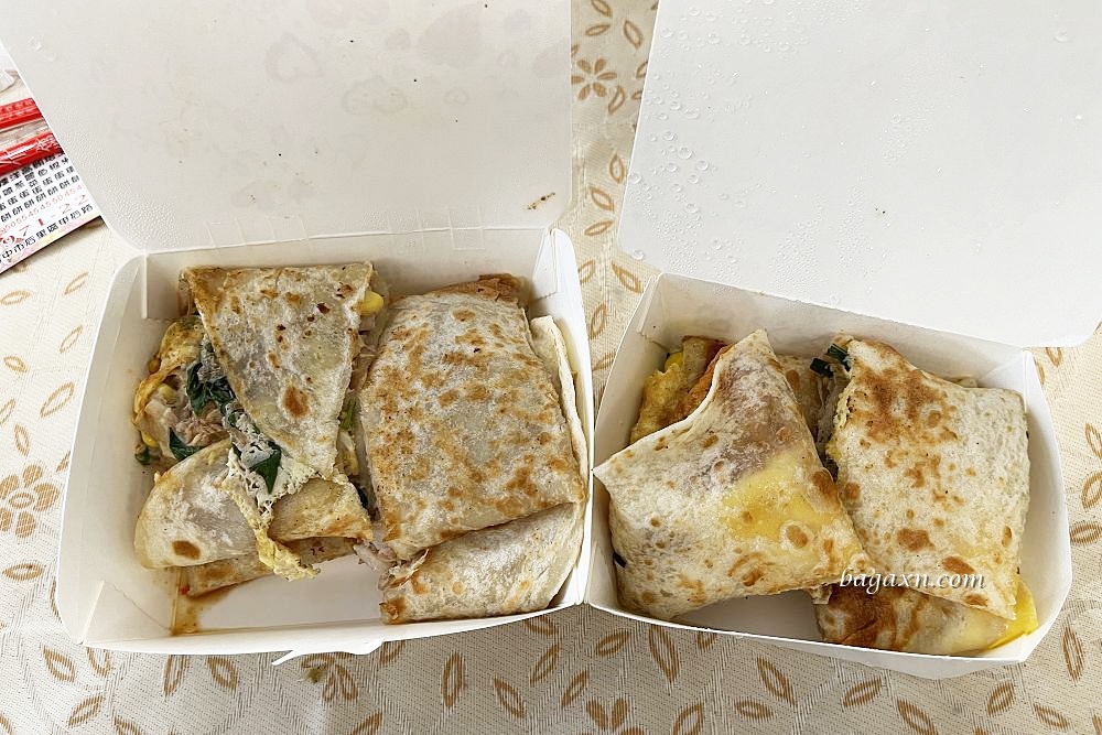蛋餅皮有一點厚度,這個吃兩塊其實就蠻飽的了。鮪魚蛋餅因為有加洋蔥丁,所以比較濕潤,建議到手馬上吃,不然會濕濕的。