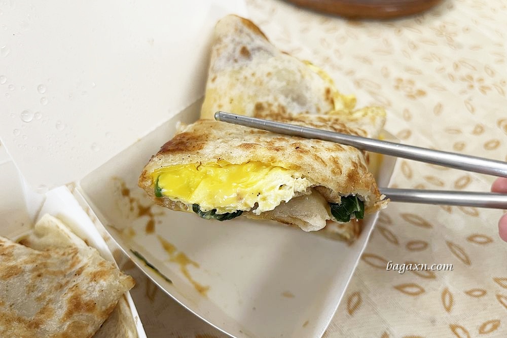 手工蛋餅都是老闆每日現桿的,蛋餅皮吃起來比較偏墨西哥餅皮那種,不是QQ軟軟那種。加了蔥花和九層塔,更香。
