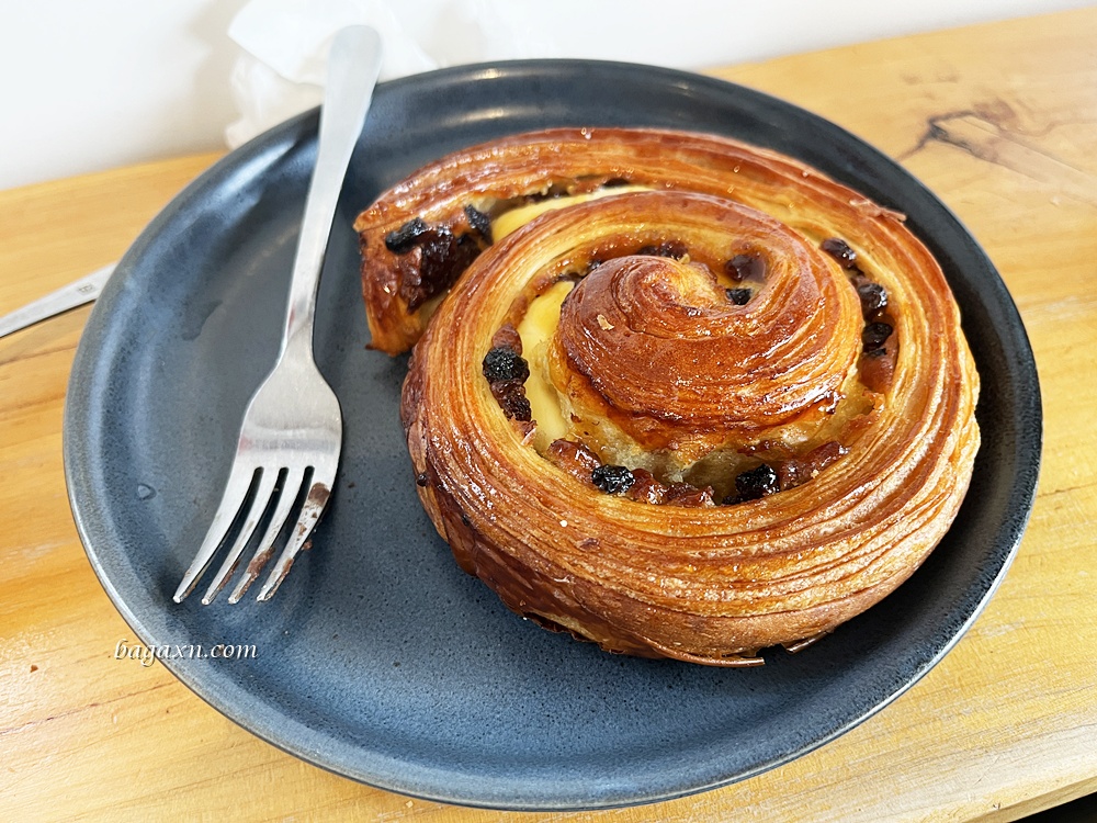 看起來很像肉桂捲的Pain aux raisins,結果他是葡萄乾丹麥卷,滋味大多是葡萄乾及卡士達奶油的風味,最外圈像是蝸牛的地方比較脆口,中間則是鬆軟的口感,是也不錯,沒吃過可以試試。